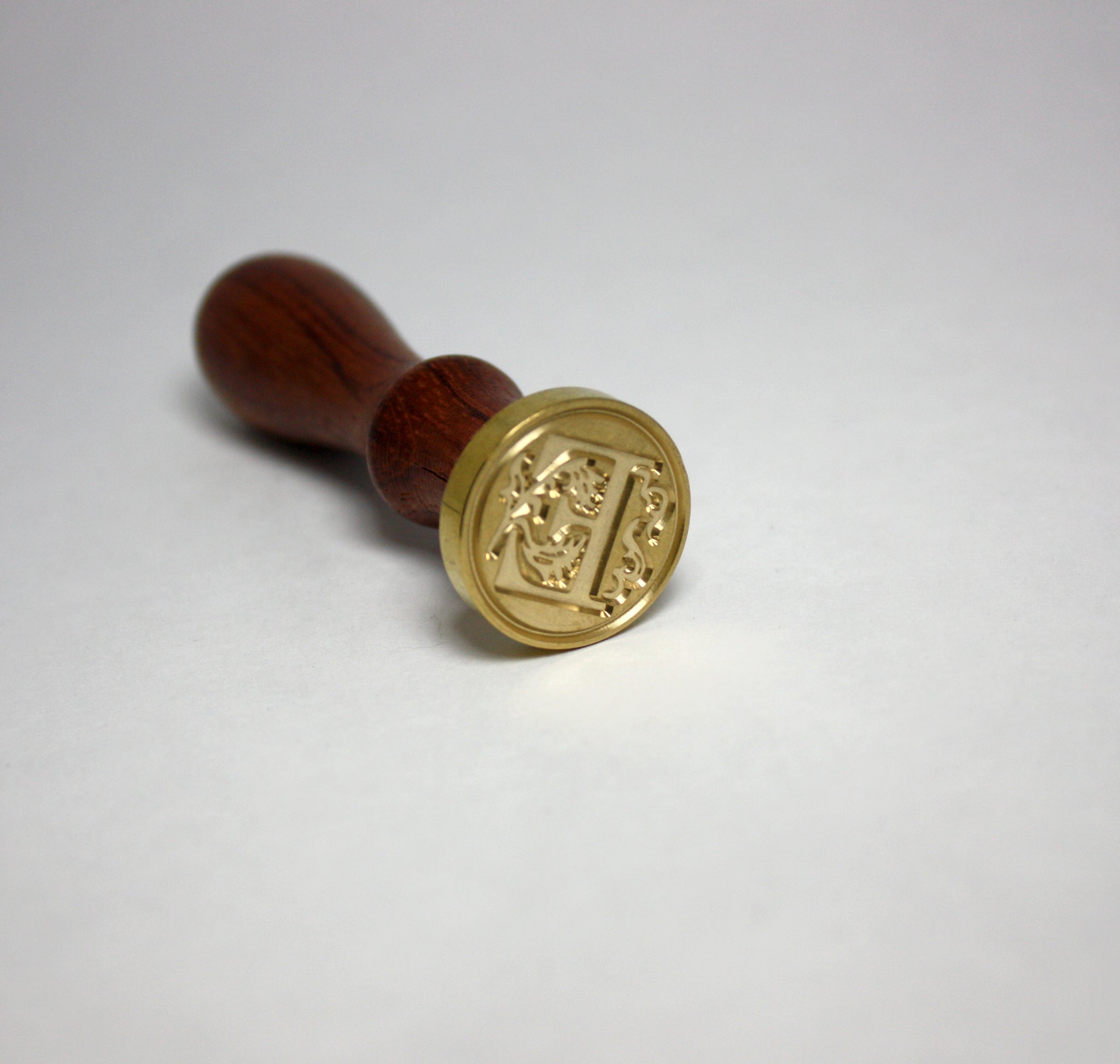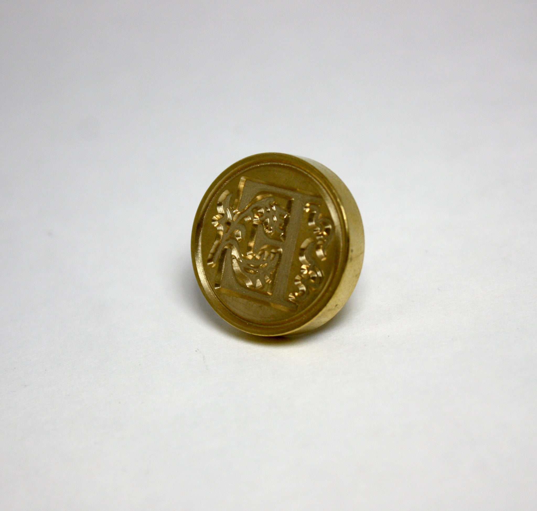 Brass seal with brown wood handle. Deeply engraved initial with a filigree background design creates a deep and clear impression in sealing wax.