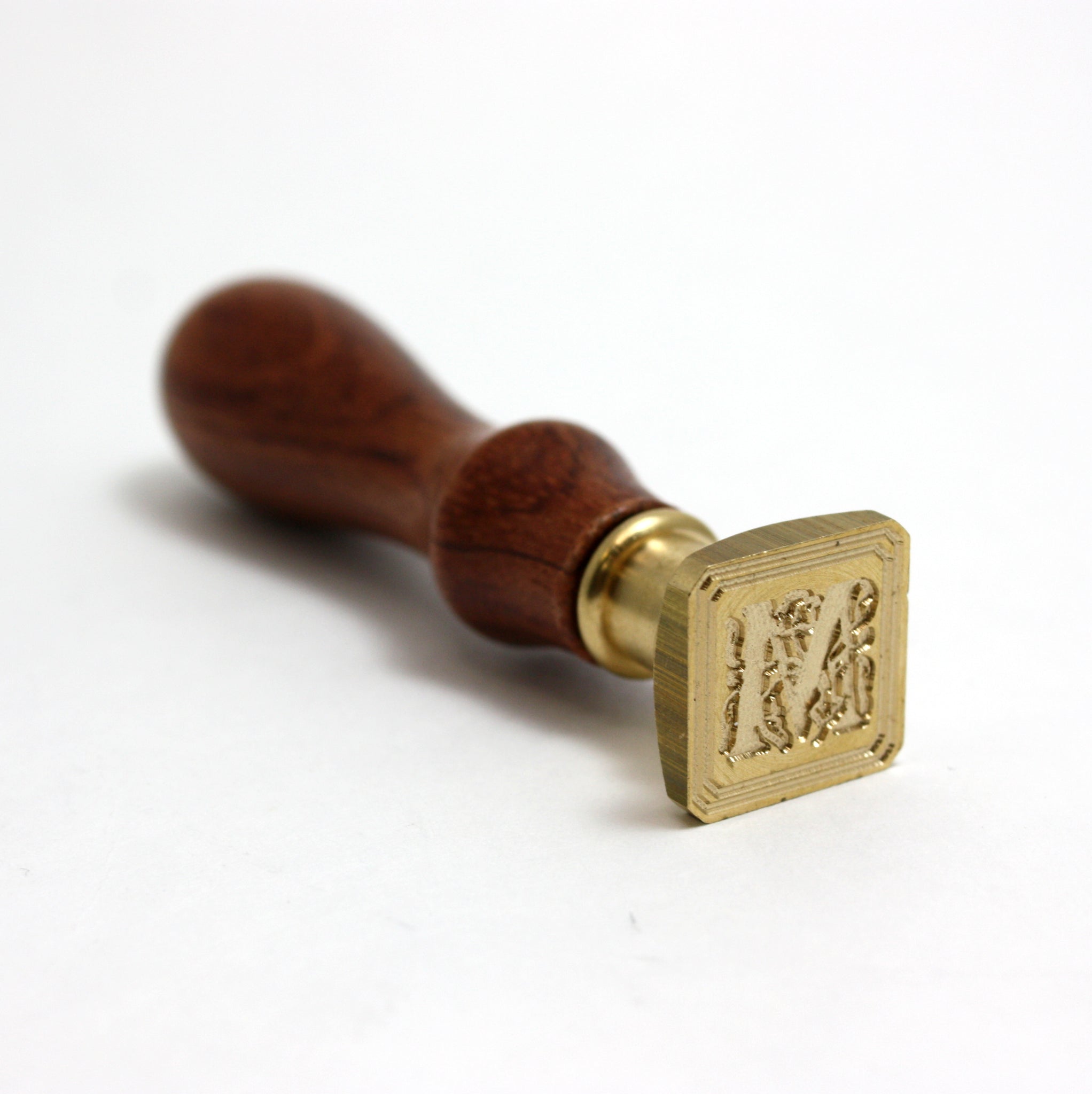 Brass seal with brown wood handle. Deeply engraved initial with a filigree background design creates a deep and clear impression in sealing wax.